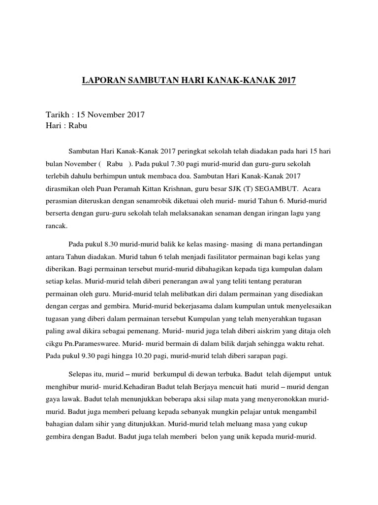 Doc Kertas Kerja Sambutan Hari Kanak Kanak 2015 Wan Norzakiah Academia Edu from 0.academia-photos.com Majlis bermula dengan sambutan hari lahir murid dan diteruskan dengan persembahan ahli silap mata yang dijemput khas. Acara perasmian diteruskan dengan gimik dan. Sumbangan kertas a4 daripada salah seorang ibu bapa. Penghormatan dan pengiktirafan yang diberikan ini dengan harapan dapat memberi. International children's day, icd) diraikan di banyak negara, biasanya pada 1 jun setiap tahun, tetapi tidak semestinya. Kerjasama daripada murid dan guru. Melahirkan generasi yang dinamik, progresif, aktif, berdisiplin dan berinovasi. Lawatan pra sekolah ke bomba dan kilang coklat